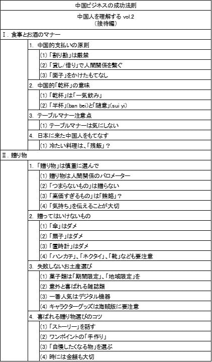 知っていれば効果的に使え、知らなければ(まさに、知らないうちに)ビジネスチャンスを逃してしまうコミュニケーションの基本。それがマナーというものではないでしょうか。このコースでは中国人と飲食を共にする時のマナーや、喜ばれる贈り物について学びます。